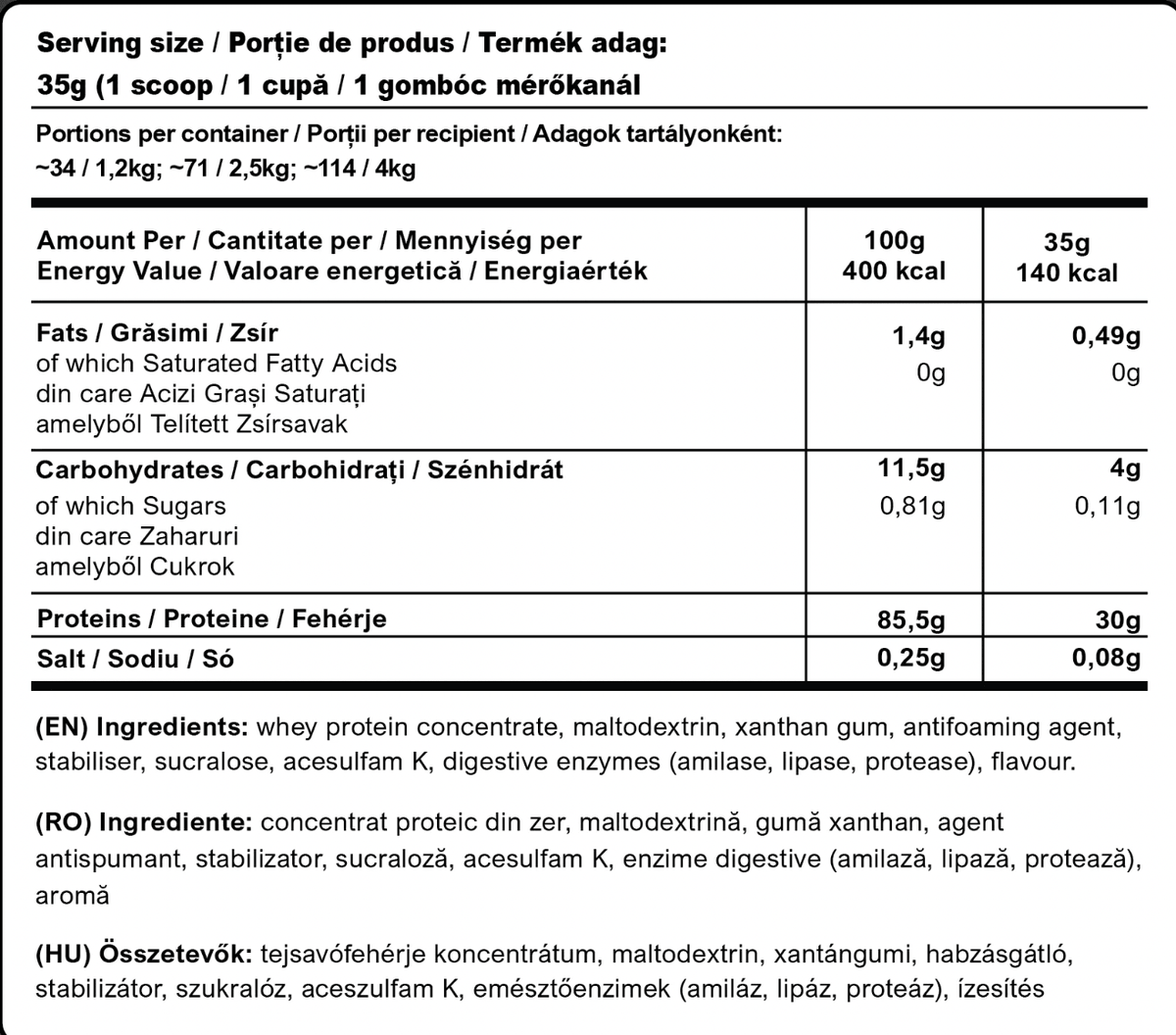 Caracteristici principale• Conținut ridicat de proteine: 30g de proteine per servire, provenite din concentratul proteic de zer (WPC).